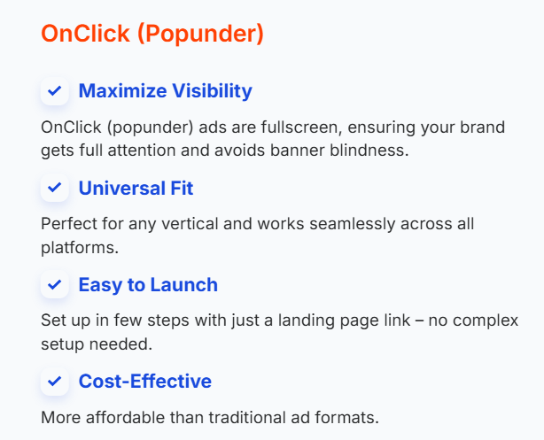 - OnClick/Popunder Ads: Guaranteed visibility, cost-effective, best for sweepstakes, betting, and high-volume campaigns.