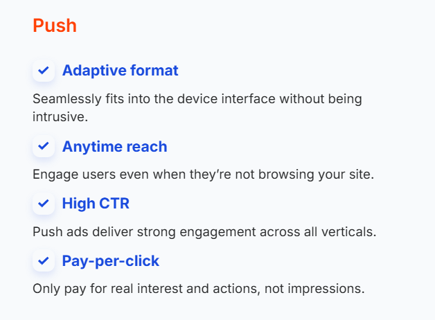 - Push Notifications: Opt-in, high CTR, direct engagement, ideal for app installs, nutra, and promotions.
