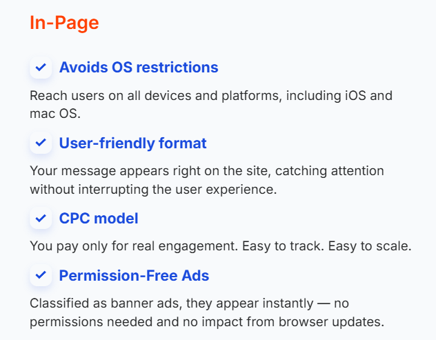 - In-Page Push: Permission-free, cross-device, combines display and push benefits, ideal for iOS and mobile users.