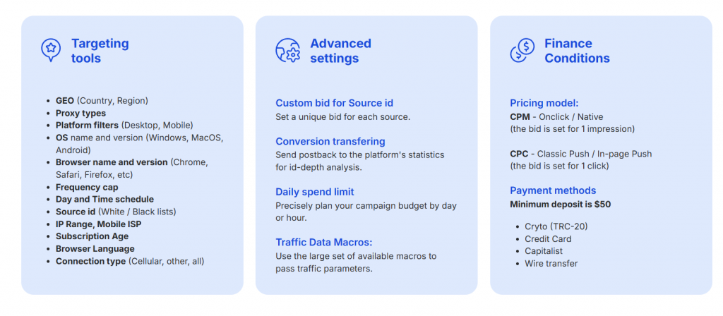 Integration with tracking platforms like Binom, Keitaro, and Voluum allows precise conversion tracking, automated postbacks, and split testing. Advanced targeting options, including GEO, device type, OS, browser, and frequency caps, enable granular audience segmentation. AI-driven automation reallocates budgets in real time, ensuring high-performing creatives and offers receive maximum exposure. Advertisers can also use the RealPush API for full campaign automation and reporting, streamlining global campaign management.