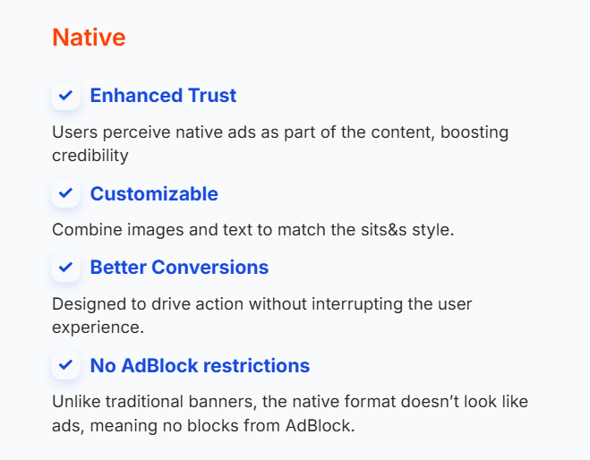 - Native Ads: Seamless integration, trust-building, bypasses ad blockers, effective for storytelling campaigns.