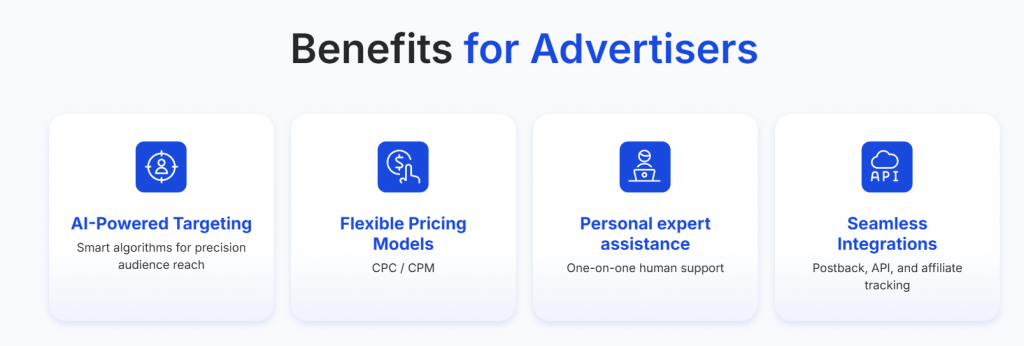 Dedicated account managers provide strategic guidance, helping advertisers choose formats, schedule campaigns, and analyze results in real time. This combination of automation, human expertise, and multi-format support ensures advertisers achieve measurable growth across verticals and regions.