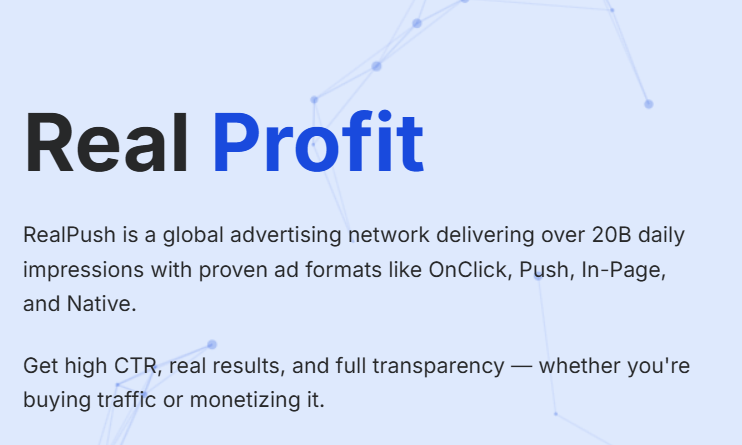With access to over 20 billion daily impressions across all geographic regions, RealPush connects advertisers to audiences globally. Its portfolio includes push notifications, popunder ads (OnClick), in-page push, and native advertising, each tailored to different campaign objectives and user engagement contexts. By integrating advanced AI optimization, automation, and seamless tracking, RealPush ensures that advertisers can maximize results while maintaining transparency and control.