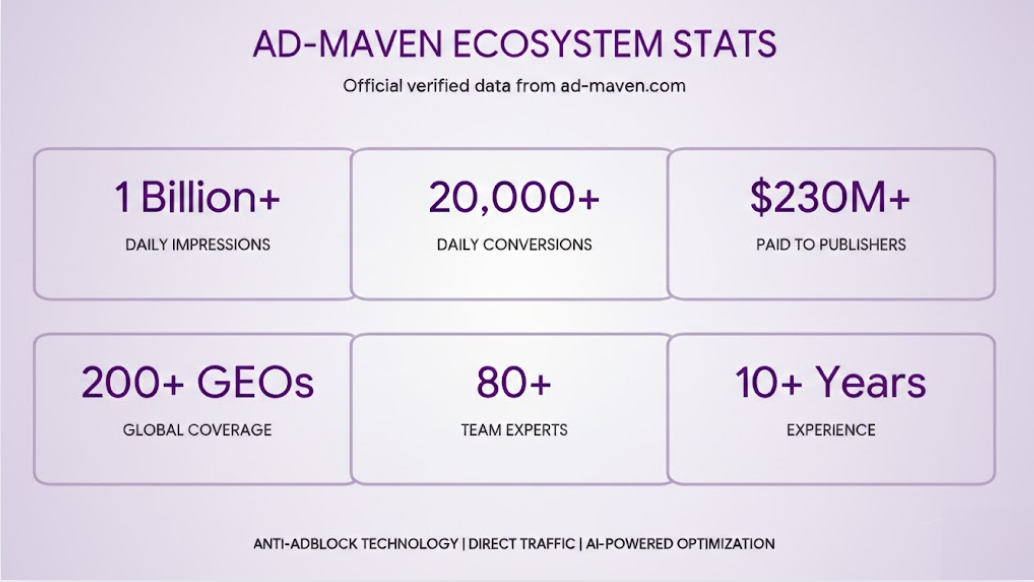 In the volatile landscape of 2026, where privacy regulations and browser restrictions have become the norm, Ad-Maven stands out by maintaining a stable, proprietary infrastructure. Operating for over a decade from its headquarters in Israel, the platform has evolved from a simple ad network into a complex programmatic ecosystem. With over 1 billion daily impressions and a track record of $230M+ paid to publishers, Ad-Maven is a primary destination for advertisers seeking high-volume, performance-ready traffic.