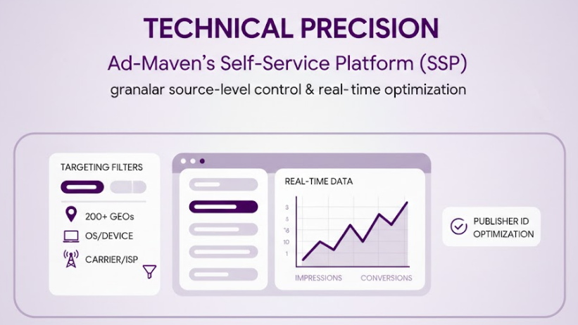 The platform’s strength lies in its Direct-to-Publisher logic. By managing over 25,000 direct publishers, Ad-Maven eliminates the “black box” nature of many ad exchanges. This direct connection ensures that advertisers are not bidding on recycled or bot-inflated traffic, but on raw, non-incentivized user interactions across 200+ GEOs.