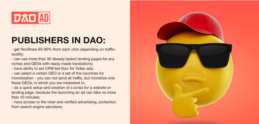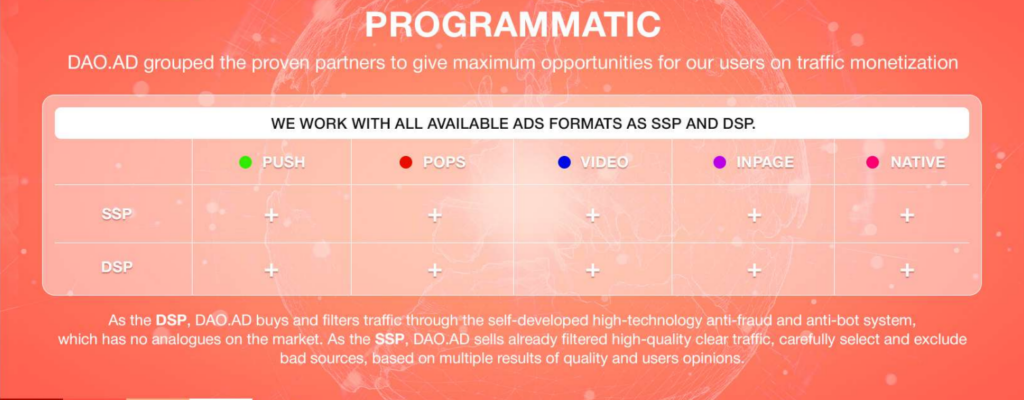 DAO.AD has grouped proven partners to provide maximum traffic monetization opportunities by working with all available ad formats as both an SSP and DSP. As a DSP, the platform buys and filters traffic through a self-developed, high-technology anti-fraud and anti-bot system that has no analogues on the market. As an SSP, DAO.AD sells high-quality clear traffic that has already been filtered, carefully selecting and excluding bad sources based on multiple quality results and user opinions.