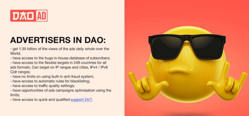 • Anti-Fraud System: DAO.AD utilizes a self-developed, high-technology anti-bot system that has no analogues on the market.