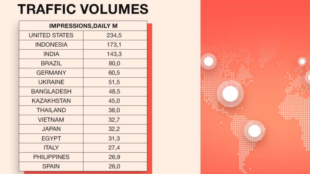 DAO.AD provides massive traffic volumes, exceeding 1,000,000,000 daily impressions, across several key regions including the USA, Germany, Ukraine, India, and Japan.